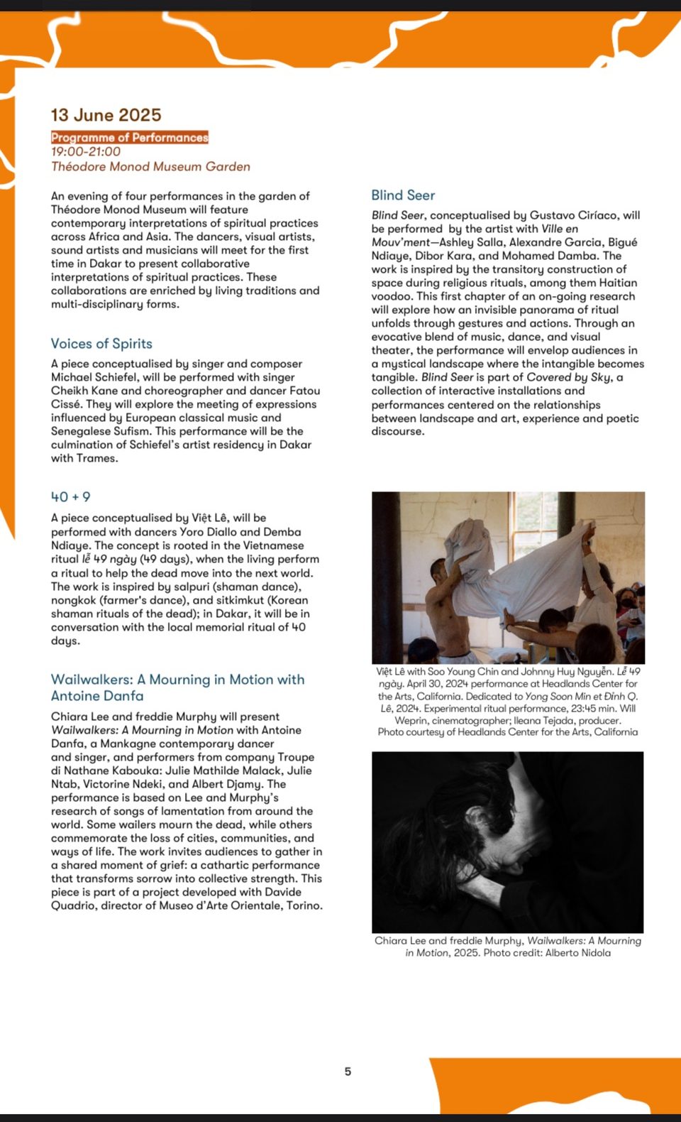 A piece conceptualised by Việt Lê, in collaboration with choreographer Fatou Cissé, dancer Demba Ndiaye and singer Yoro Diouf. This new commission is rooted in the Vietnamese ritual lễ 49 ngày (49 days), when the living perform a ritual to help the dead move into the next world. The work is inspired by salpuri (shaman dance), nongkok (farmer’s dance), and sitkimkut (Korean shaman rituals of the dead); in Dakar, it was in conversation with the local memorial ritual of 40 days. This ritual-performance is a meditation on lamentation, liberation and celebration.